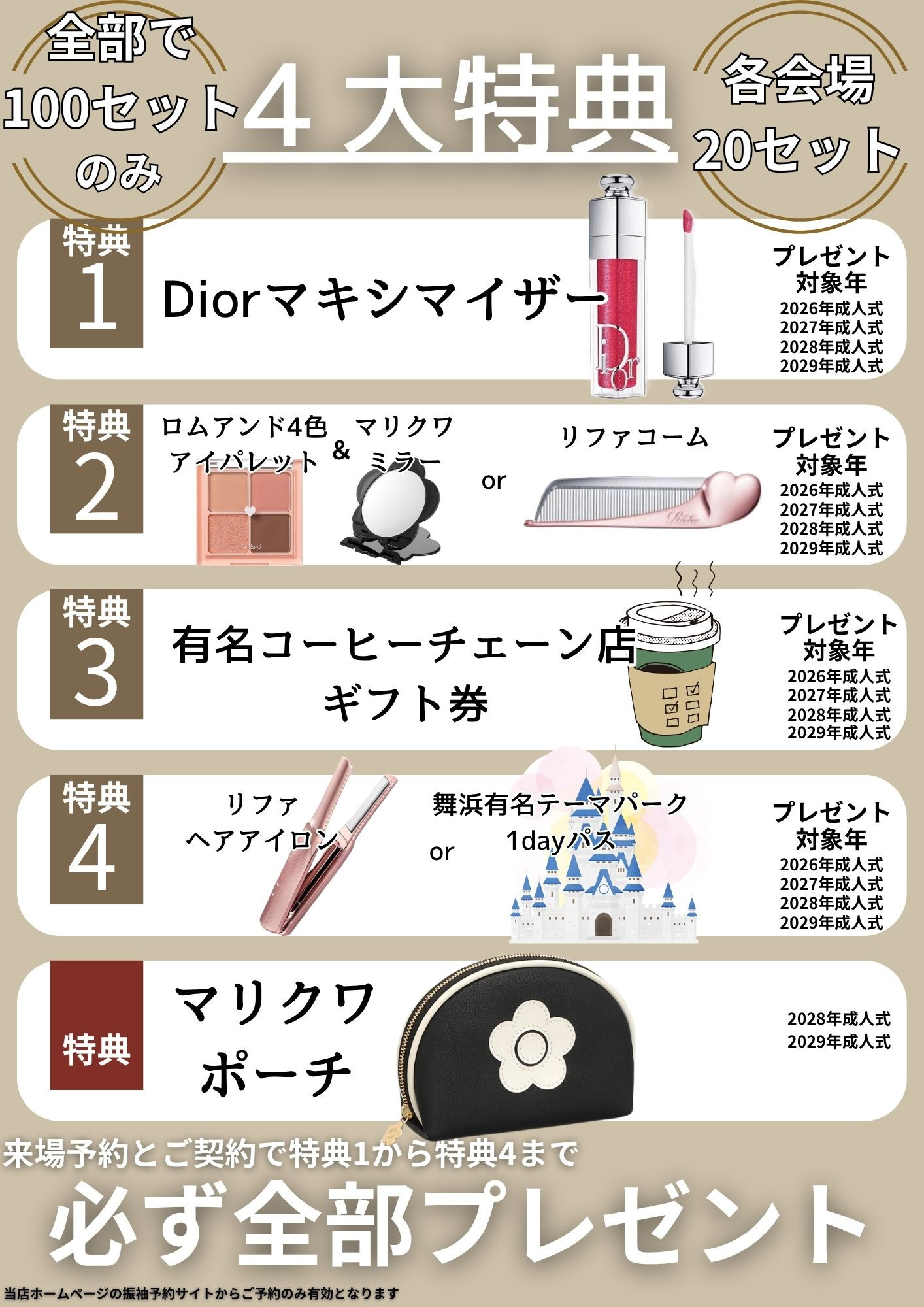 ※振袖価格(98,000円商品を除く)とお仕度代で144,500円(税抜き)以上の方への特典となります。
